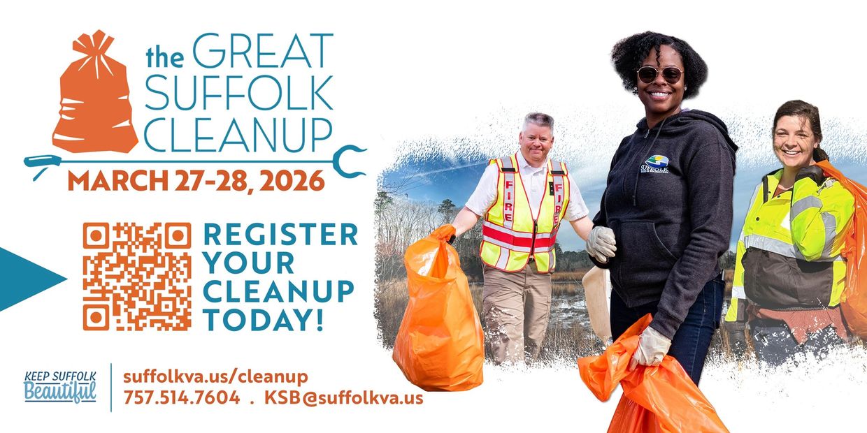 & 28, 2026. Come out and join us in cleaning up Suffolk, VA, The Great Suffolk Clean Up isn't just about cleaning up liter, its about bringing people together throughout the community, building bonds, creating friendships, meeting new people, and working for one cause, to clean up our city. A cleaner Suffolk will promote growth in small businesses, build up pride in neighborhoods, and be more welcoming to visitors.